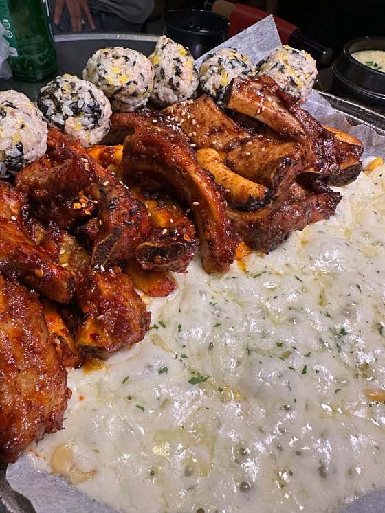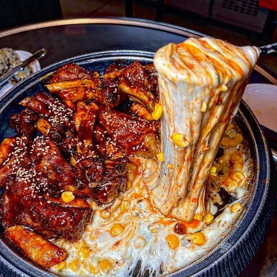 매운 등갈비 위에 듬뿍 올린 치즈의 고소함이 중화 역할을 해줘
