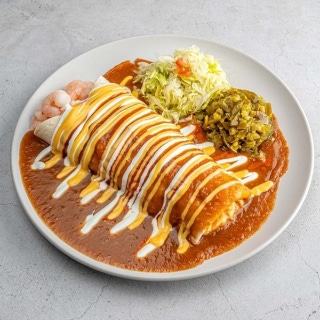 엔칠라다는 치즈와 라이스, 고기를 넣은 또띠아를 특제 소스와 함께 제공하는 멕시코식 오므라이스입니다. 부드럽고 깊은 맛의 소스가 일품이며, 가격은 13,500원입니다.