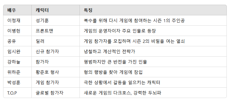 - 이정재 (성기훈): 시즌 1의 우승자이자 주인공으로, 시즌 2에서 더 큰 비밀을 파헤치기 위해 게임에 다시 뛰어듭니다.