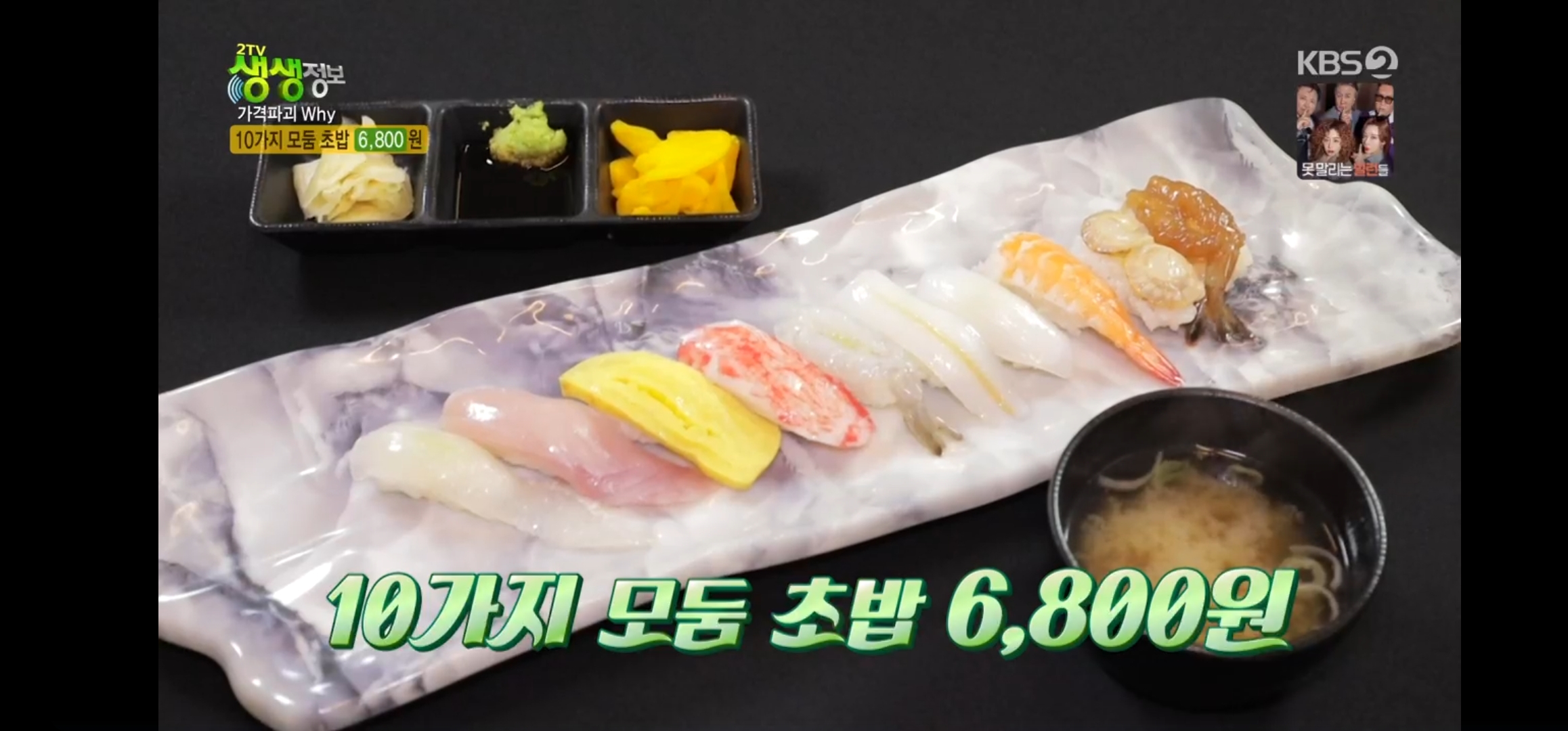 3월 13일 방송된 ‘2TV 생생정보’의 ‘가격파괴 Why’ 코너에서는 인천 부평에 위치한 ‘초밥나라’가 소개되었습니다. 일반적으로 초밥은 고급 음식으로 알려져 있지만, 이곳에서는 점심 특선으로 10가지 모둠초밥을 단돈 6,800원에 맛볼 수 있어 화제가 되었습니다. 신선한 재료를 사용하면서도 저렴한 가격으로 제공되는 것이 큰 장점입니다.