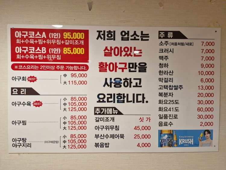 - 활아귀수육: 85,000원