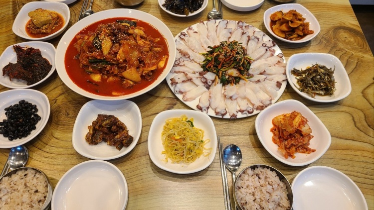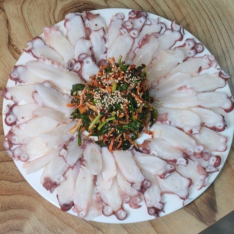 ‘홍선장의 밥상’에서는 청정 동해에서 갓 잡아 올린 해산물을 사용하여 신선도를 보장합니다. 특히 문어는 생물로 제공되기 때문에 쫄깃한 식감이 살아 있습니다.